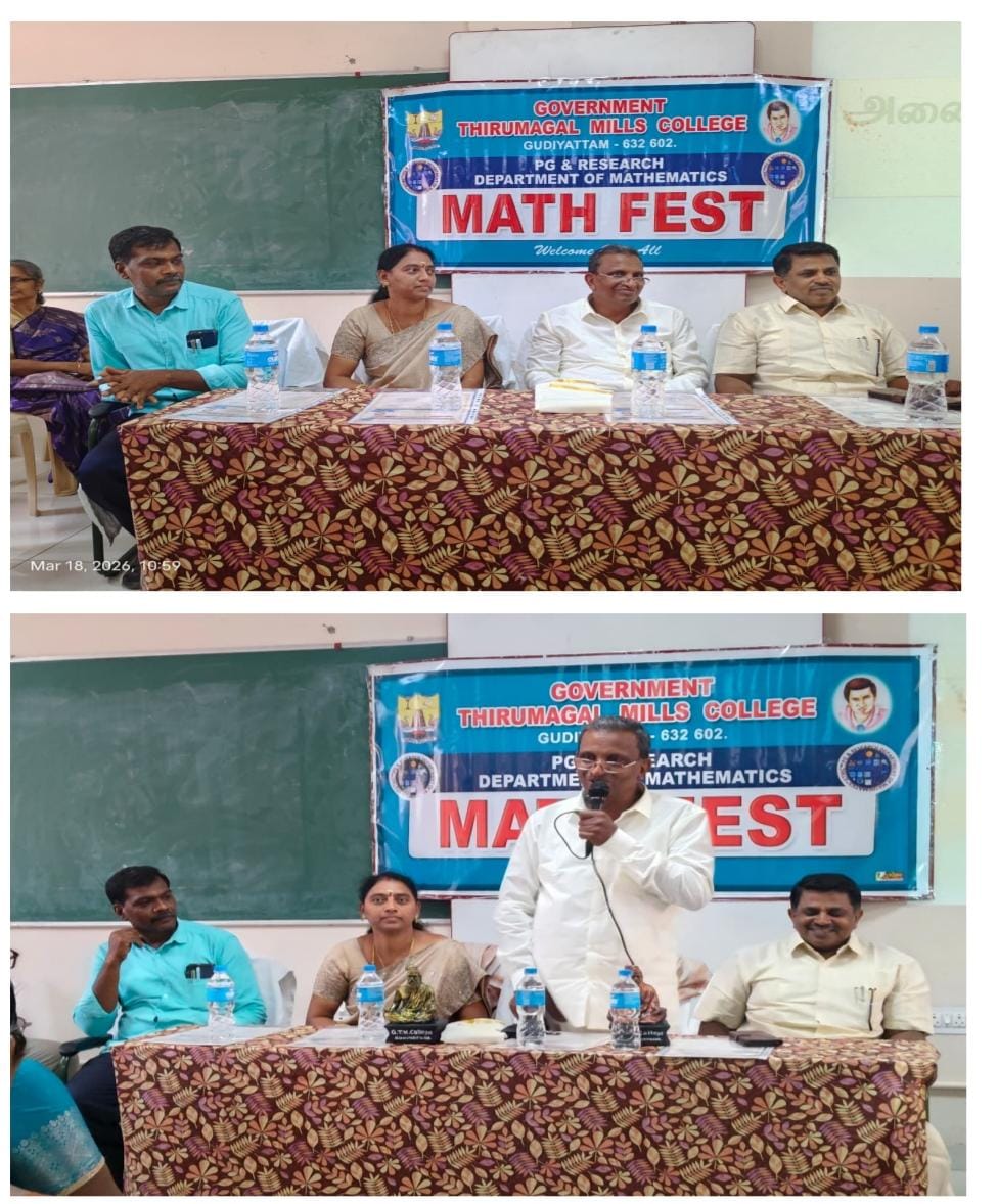 குடியாத்தம்: வேலூர் மாவட்டம் குடியாத்தத்தில் உள்ள அரசினர் திருமகள் ஆலைக் கல்லூரியில் கணிதத் துறை சார்பாக MATH FEST 2026 நிகழ்ச்சி மார்ச் 18 அன்று சிறப்பாக நடைபெற்றது. இந்த கருத்தரங்கிற்கு கல்லூரி முதல்வர் ஜே. எபனேசர் தலைமை தாங்கினார். கணிதத்…