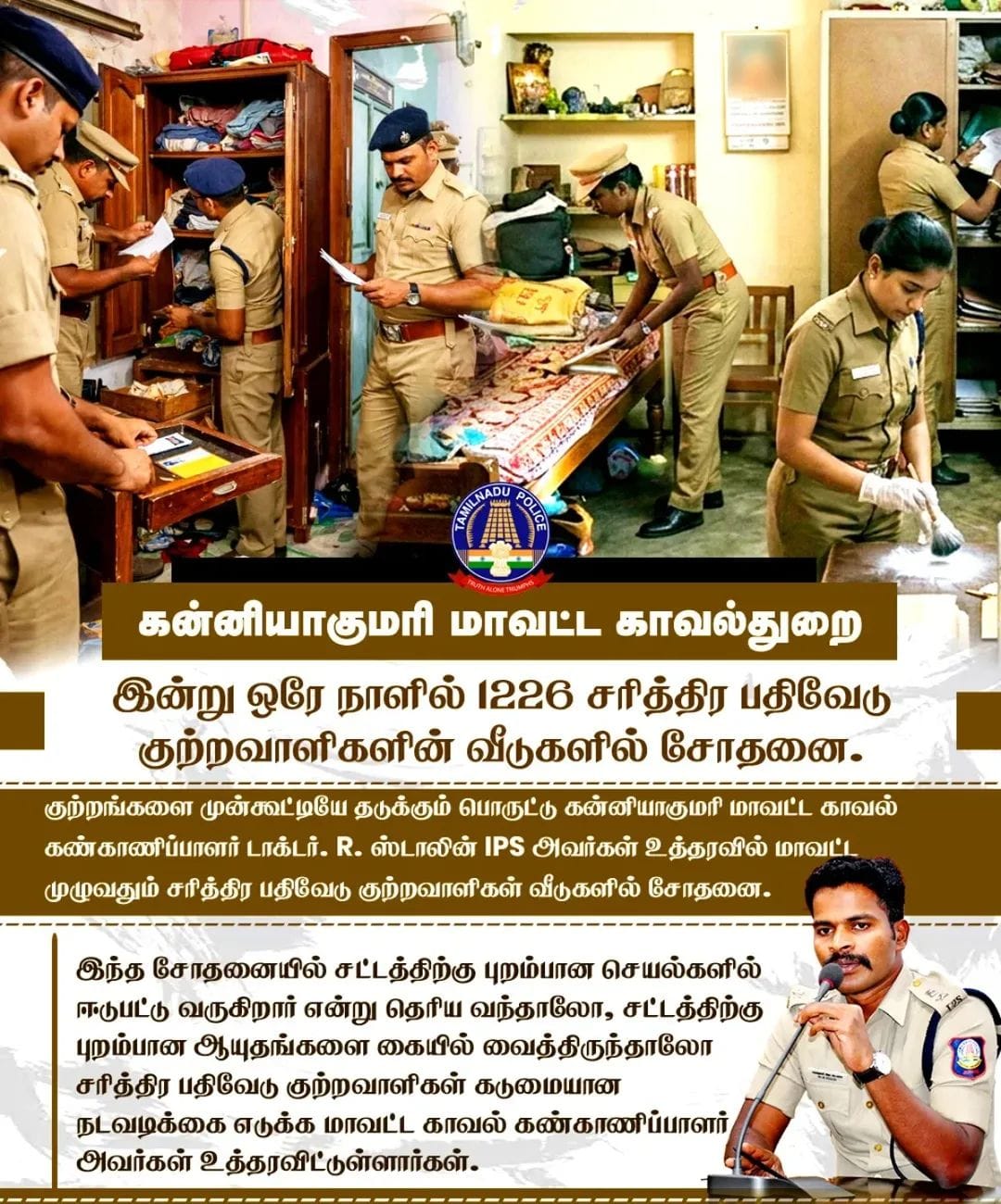 குற்றங்களை முன்கூட்டியே தடுக்கும் நடவடிக்கை: ஒரே நாளில் 1226 சரித்திர பதிவேடு குற்றவாளிகள் வீடுகளில் சோதனை. கன்னியாகுமரி மாவட்ட காவல் கண்காணிப்பாளர் டாக்டர். R. ஸ்டாலின் IPS அவர்களின் உத்தரவின் பேரில், மாவட்டம் முழுவதும் இன்று ஒரே நாளில் 1226 சரித்திர…