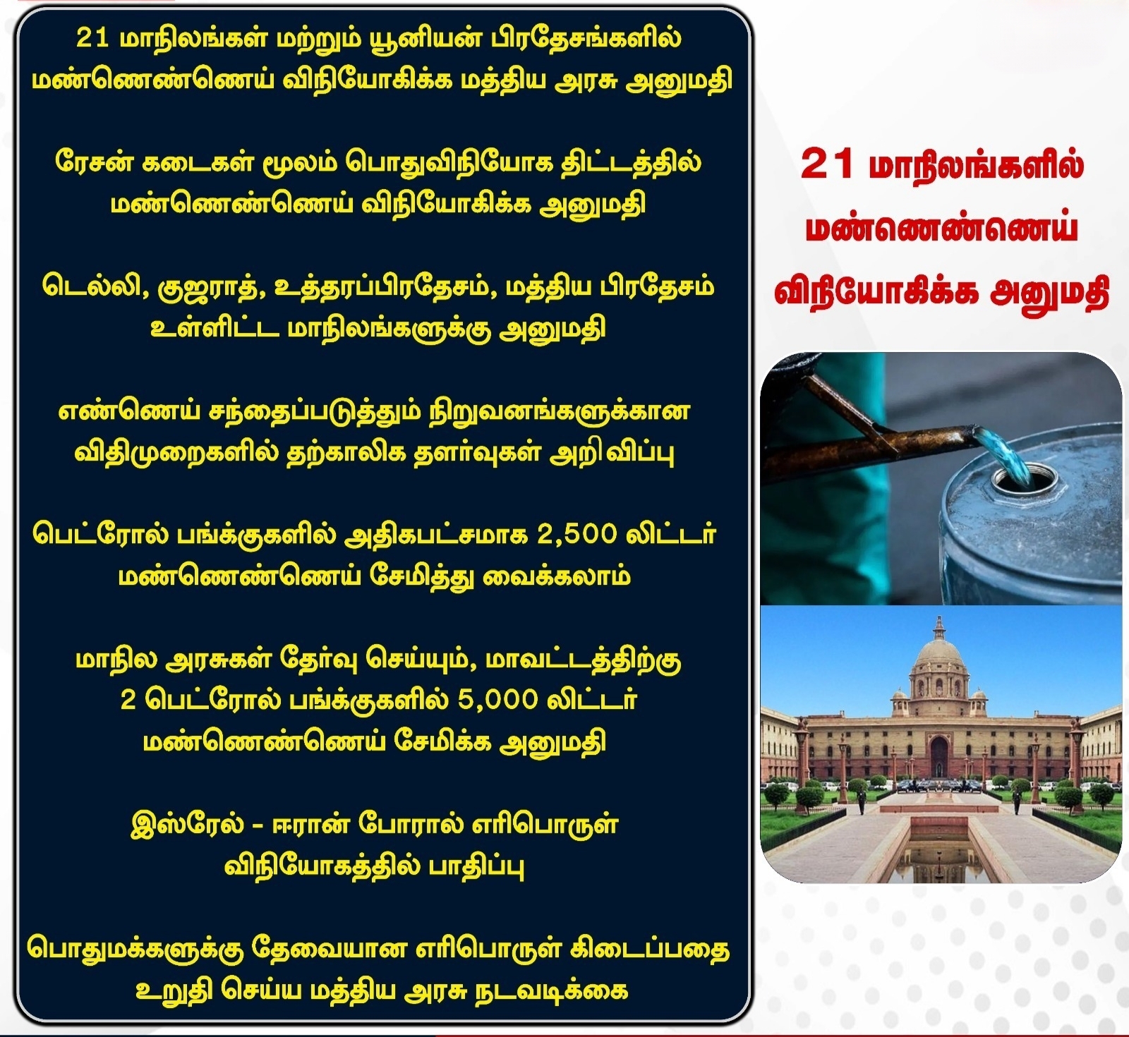 ⛽ எரிபொருள் நெருக்கடி – மத்திய அரசு அவசர முடிவு…? 🌍 Israel–Iran conflict காரணமாக எரிபொருள் விநியோகத்தில் பாதிப்பு ஏற்பட்டுள்ள நிலையில், மத்திய அரசு முக்கிய அறிவிப்பு வெளியிட்டுள்ளது. 🛢️ 21 மாநிலங்களுக்கு மண்ணெண்ணெய் அனுமதி: 👉 21 மாநிலங்கள்…