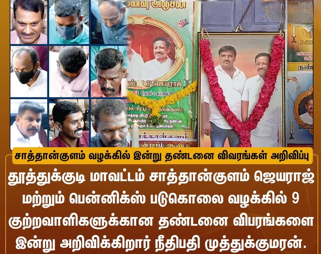🔴 சாத்தான்குளம் வழக்கு…? 📍 தூத்துக்குடி மாவட்டம், சாத்தான்குளம்👉 ஜெயராஜ் – பென்னிக்ஸ் தந்தை, மகன் உயிரிழப்பு வழக்கு 👨⚖️ நீதிமன்ற நடவடிக்கை…? 👉 9 குற்றவாளிகளுக்கான தண்டனை விவரங்களை இன்று அறிவிக்கிறார்Muthukkumaran 👉 கடந்த 23ஆம் தேதி:✔ 9 பேரும்…