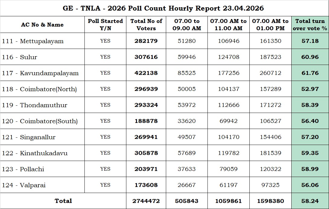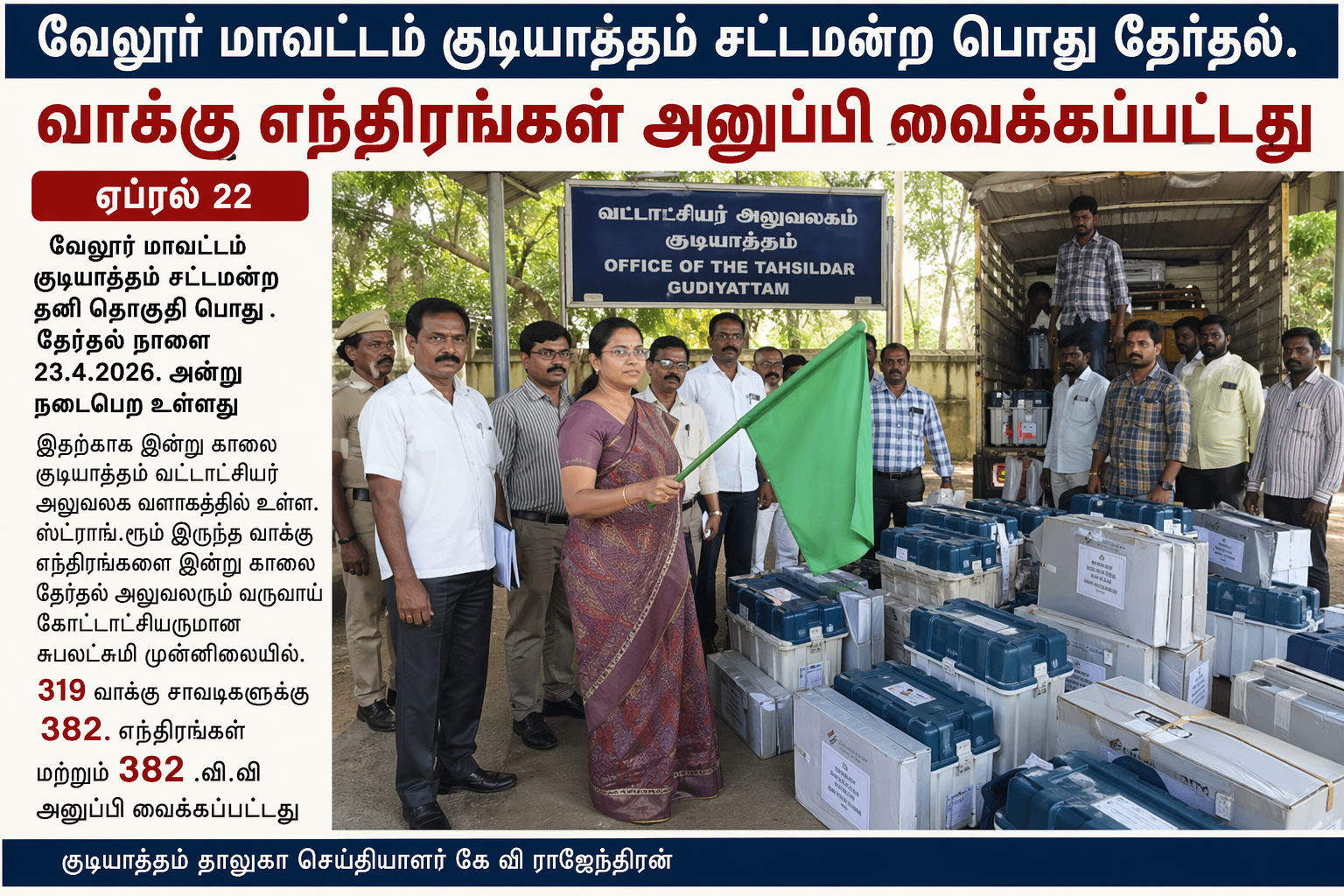 தேதி: ஏப்ரல் 22, 2026இடம்: வேலூர் மாவட்டம், குடியாத்தம் வேலூர் மாவட்டம் குடியாத்தம் சட்டமன்ற தனி தொகுதியில் நடைபெற உள்ள பொதுத்தேர்தலுக்கான வாக்குப்பதிவு நாளை (23.04.2026) நடைபெறுகிறது. இதனை முன்னிட்டு, இன்று காலை குடியாத்தம் வட்டாட்சியர் அலுவலக வளாகத்தில் உள்ள ஸ்ட்ராங்…