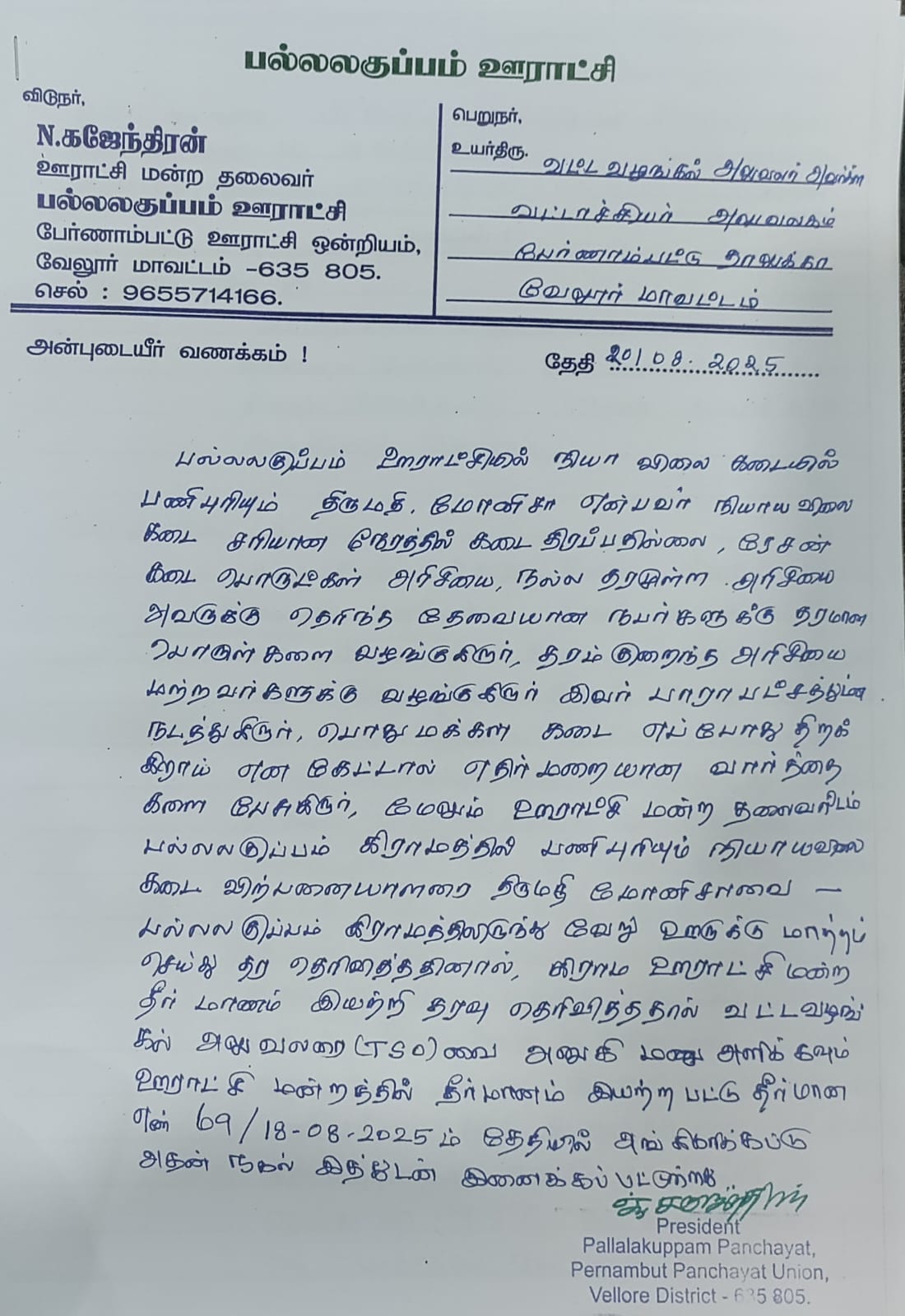 வேலூர் மாவட்டம் பேரணாம்பட்டு அருகே உள்ள பல்லலகுப்பம் ஊராட்சியில் செயல்படும் நியாய விலை கடை விற்பனையாளரை மாற்றக்கோரி அப்பகுதி மக்கள் மற்றும் ஊராட்சி மன்றம் சார்பில் தீர்மானம் நிறைவேற்றப்பட்டது.