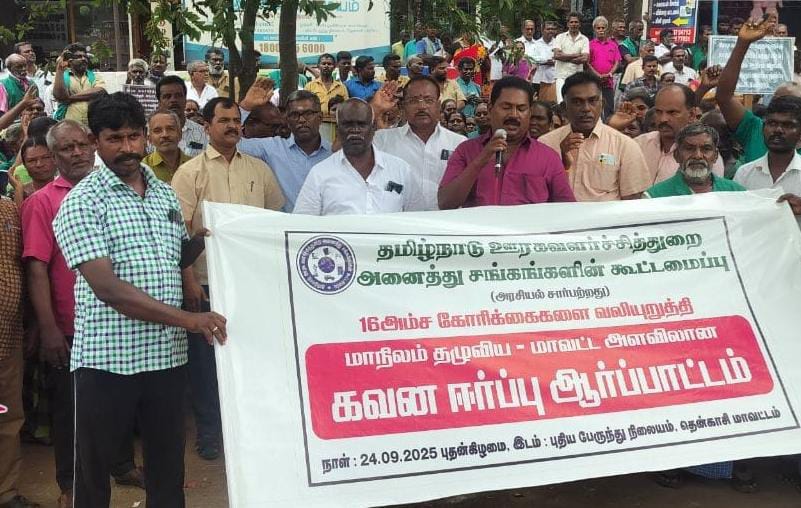 தமிழ்நாடு ஊரக வளர்ச்சித் துறை அனைத்து சங்கங்களின் கூட்டமைப்பு சார்பாக 16 அம்ச கோரிக்கைகளை வலியுறுத்தி, மாநிலம் தழுவிய கவன ஈர்ப்பு ஆர்ப்பாட்டம் தென்காசி புதிய பேருந்து நிலையம் முன்பாக நடைபெற்றது.