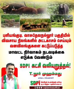 புளியங்குடி – வாசுதேவநல்லூர் பகுதிகளில் விவசாயிகளை அச்சுறுத்தும் வனவிலங்குகள் : மாவட்ட நிர்வாகம் நடவடிக்கை எடுக்க வேண்டும் – SDPI