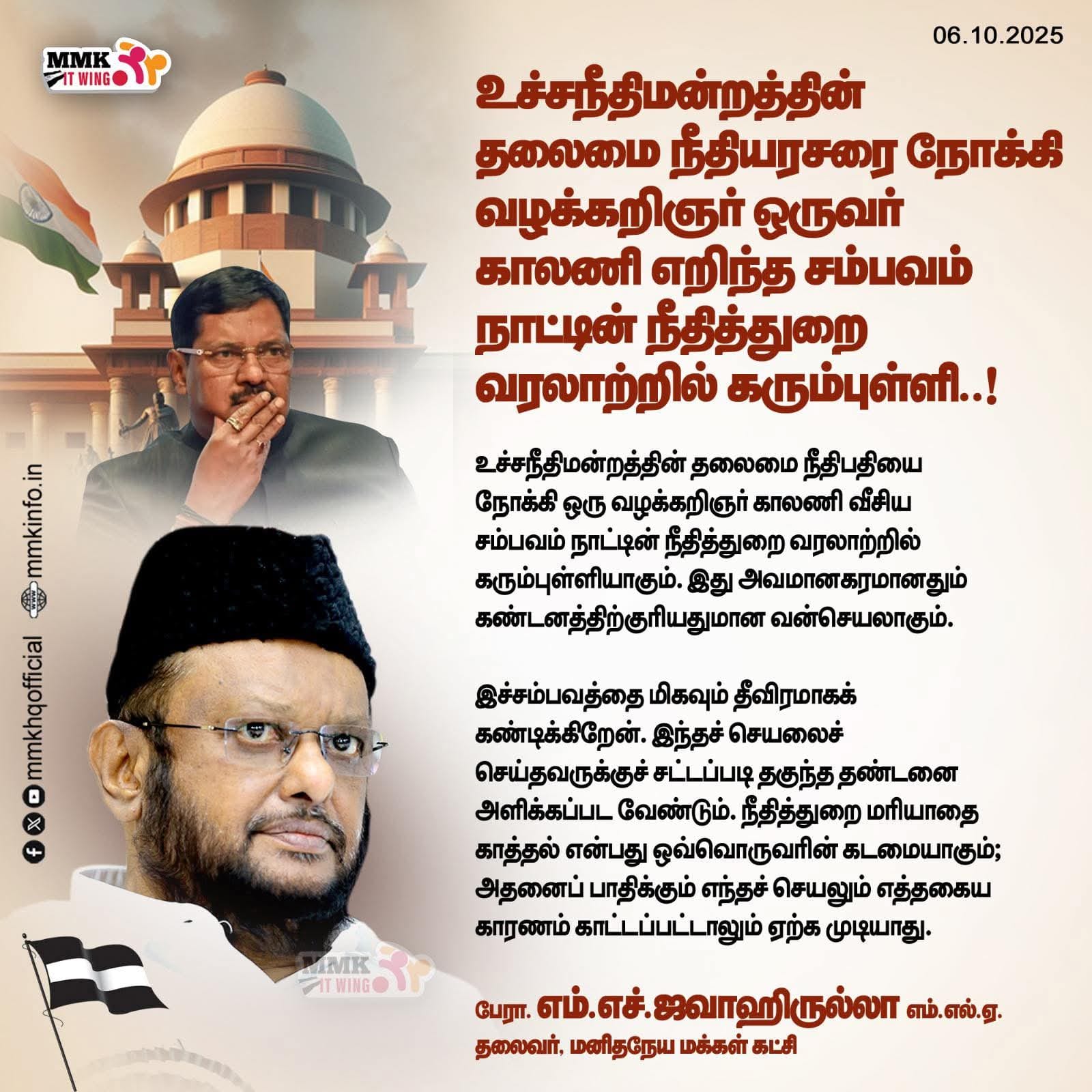 இன்று உச்சநீதிமன்றத்தின் தலைமை நீதிபதியை நோக்கி ஒரு வழக்கறிஞர் காலணி வீசிய சம்பவம் நாட்டின் நீதித்துறை வரலாற்றில் கரும்புள்ளியாகும். இது அவமானகரமானதும் கண்டனத்திற்குரியதுமான வன்செயலாகும்.