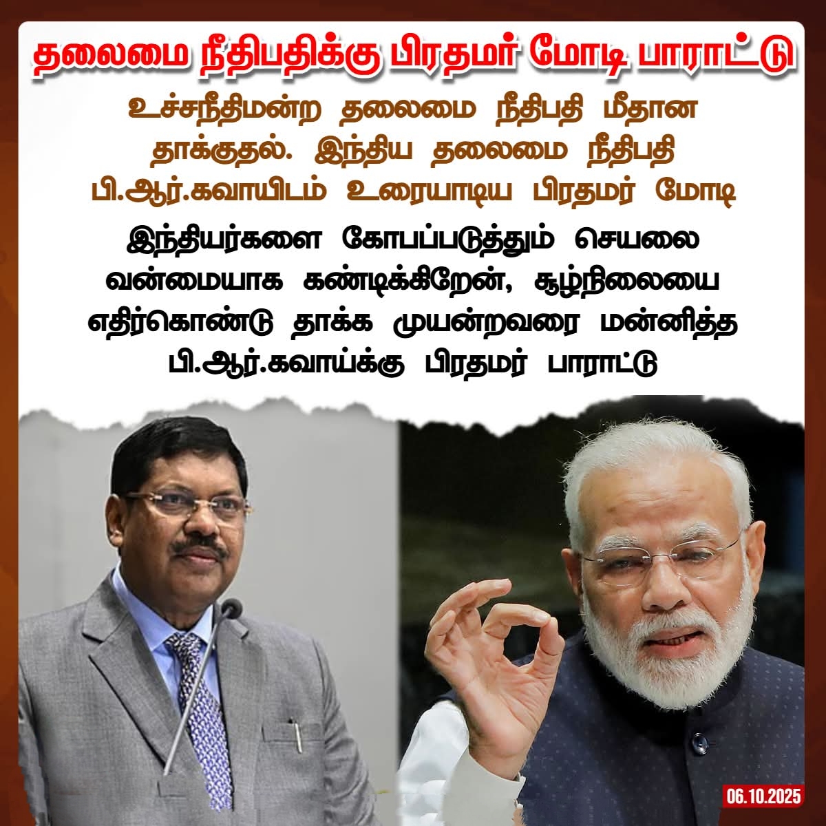 பிரதமர் மோடி, “இந்தியர்களை கோபப்படுத்தும் வகையில் நடந்த இந்த செயல் ஜனநாயகத்தின் அடித்தளத்தையே குலைக்கும் ஒரு அவலச்சம்பவம். ஆனால் அதனை அமைதியாகவும் உயர்ந்த மனப்பான்மையுடனும் எதிர்கொண்ட பி.ஆர்.கவாய் அவர்களின் பண்புக்காக நான் ஆழ்ந்த பாராட்டுத் தெரிவித்துக்கொள்கிறேன்,” என்று குறிப்பிட்டதாக தகவல்கள் தெரிவிக்கின்றன.
