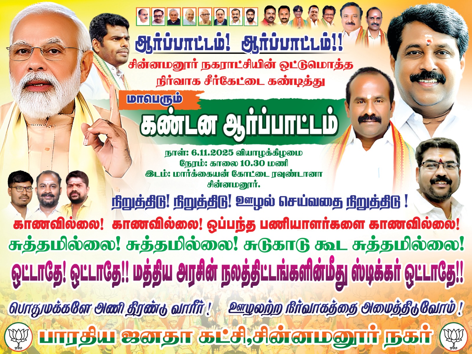 “சின்னமனூர் மக்களே! நிர்வாகத்தின் சீர்கேட்டை எதிர்த்து நாம் அனைவரும் ஒன்றிணைந்துள்ளோம். இன்று எழுப்பப்பட்ட கோரிக்கைகள் உடனடியாக நிறைவேற்றப்பட வேண்டும்; இல்லையெனில், பாஜக மக்களோடு இணைந்து தொடர்ந்தும் போராடும்,” என்று ராஜபாண்டியன் எச்சரித்தார்.