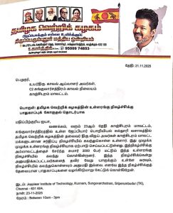 இந்த நிகழ்ச்சிக்கான பாதுகாப்பு ஏற்பாடுகளை வலியுறுத்தி, தவெக திருப்பெரும்புதூர் மத்திய ஒன்றிய செயலாளர் எஸ். கார்த்திக், சுங்குவார்சத்திரம் காவல் ஆய்வாளரிடம் கடிதம் அளித்துள்ளார்.