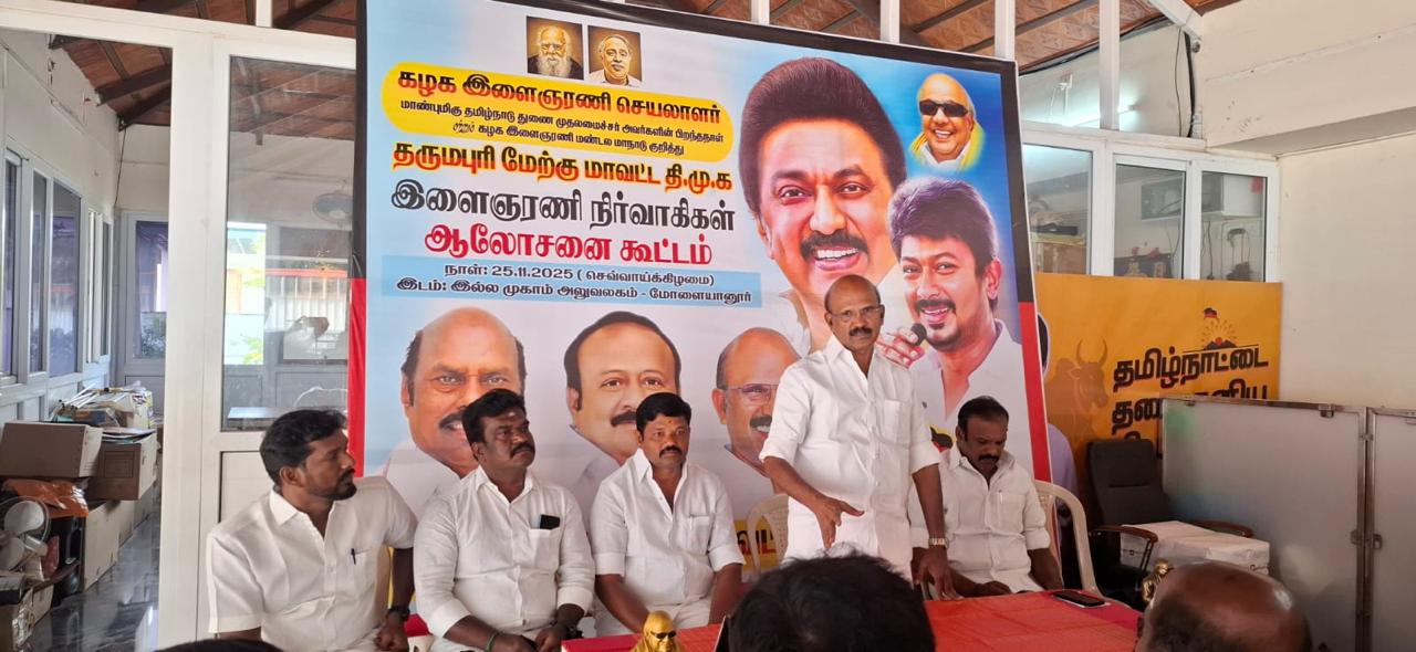 கூட்டம் தருமபுரி மேற்கு மாவட்ட கழகச் செயலாளர் முன்னாள் அமைச்சர் பி. பழனியப்பன் தலைமையில் நடைபெற்றது. மாவட்ட இளைஞரணி அமைப்பாளர் ஆர். சிவகுரு வரவேற்றார். மாவட்ட துணை அமைப்பாளர்கள் மகேஷ்குமார், நாசர், ஹரிபிரசாத் உள்ளிட்டோர் முன்னிலை வகித்தனர்.