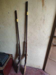 வனவிலங்குகளை வேட்டையாட பதுக்கிய இரண்டு நாட்டு துப்பாக்கிகள் பறிமுதல், ஒருவர் கைது.