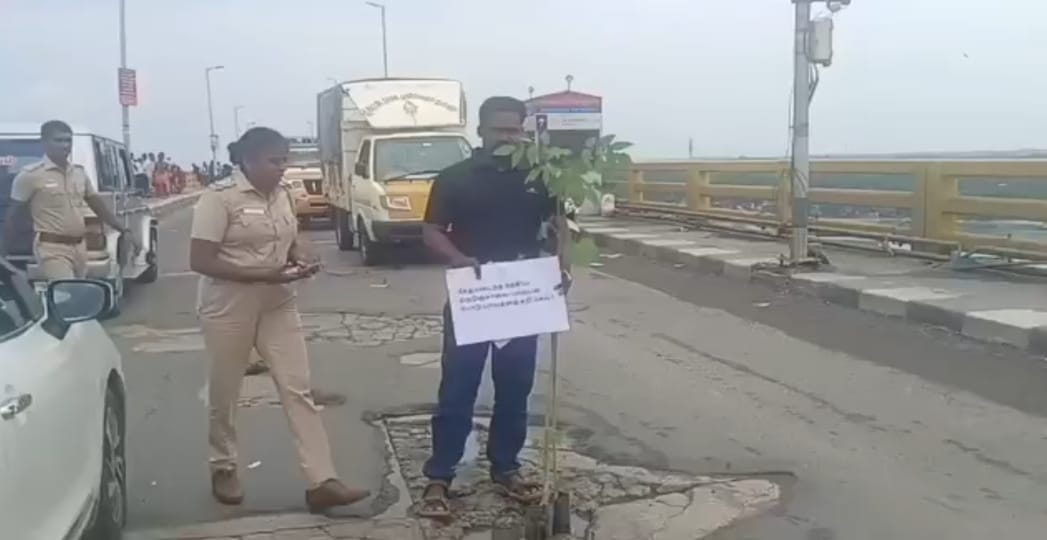 பாம்பன் பாலத்தில் உள்ள பெரிய பள்ளத்தில் ஒரு நபர் மரக்கன்று நட்டு, பதாகை ஏந்தி தனித்துவமான முறையில் போராட்டம் செய்தார்.