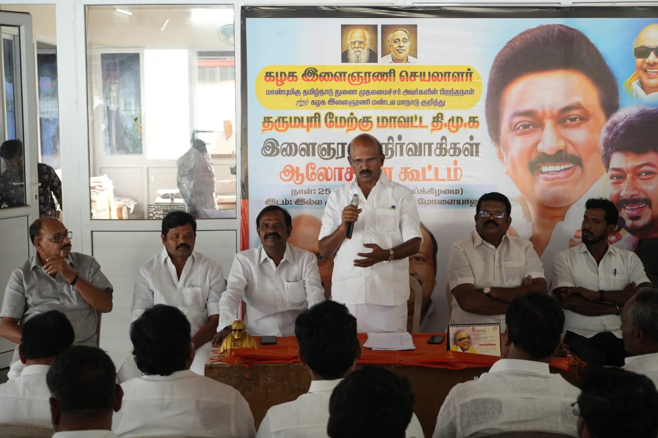 தமிழ் நாடு முன்னேற்றக் கழகம் (திமுக) இளைஞர் அணியின் வடக்கு மண்டல நிர்வாகிகள் சந்திப்பு கூட்டம் எதிர்வரும் 14.12.2025 அன்று திருவண்ணாமலையில் நடைபெற உள்ளதை முன்னிட்டு, தருமபுரி மேற்கு மாவட்ட திமுக இளைஞர் அணி மாவட்ட, ஒன்றிய, பேரூர் அமைப்பாளர்கள் மற்றும் துணை அமைப்பாளர்கள் ஆலோசனைக் கூட்டம் நடைபெற்றது.