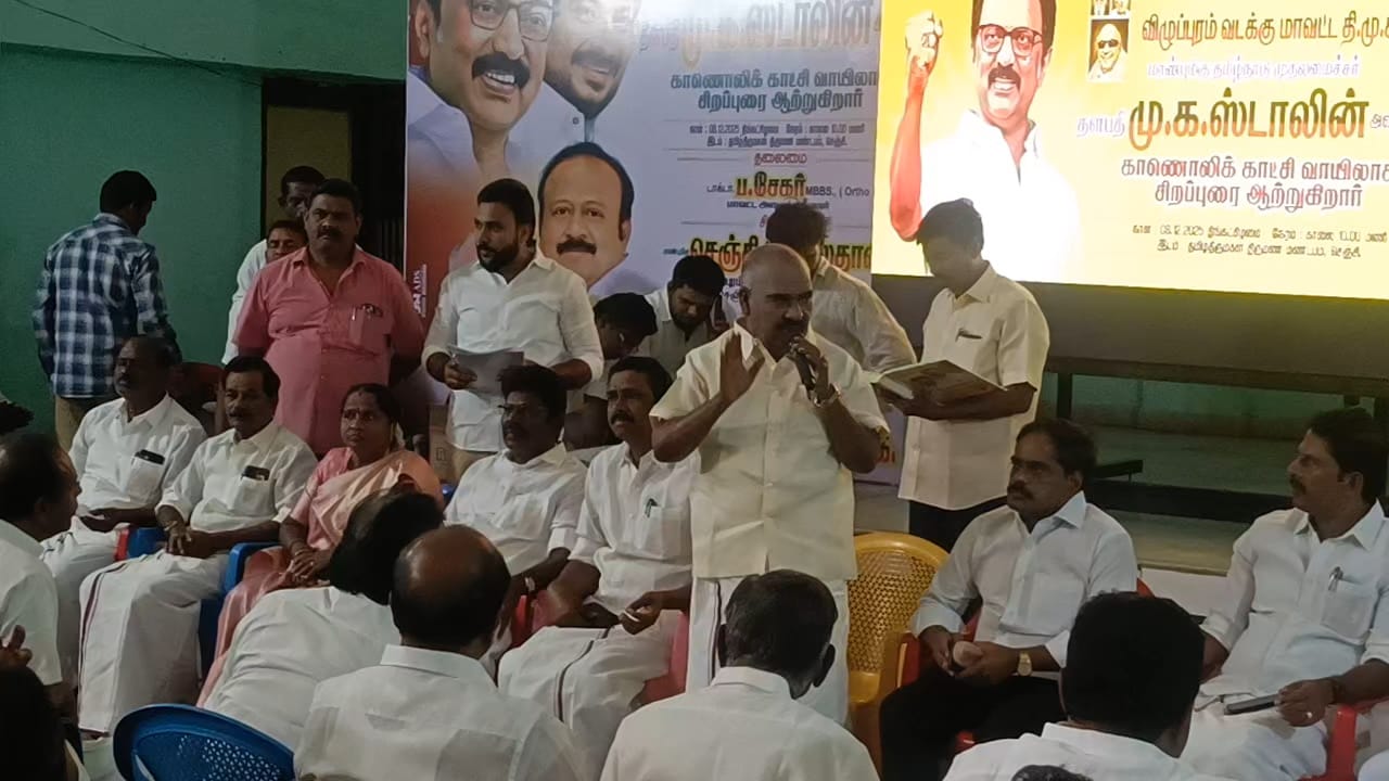 இந்தக் கூட்டத்தில், விழுப்புரம் வடக்கு மாவட்ட திமுக நிர்வாகிகள் செஞ்சியில் உள்ள தனியார் திருமண மண்டபத்தில் இருந்து காணொளி வாயிலாக கலந்துகொண்டனர்.