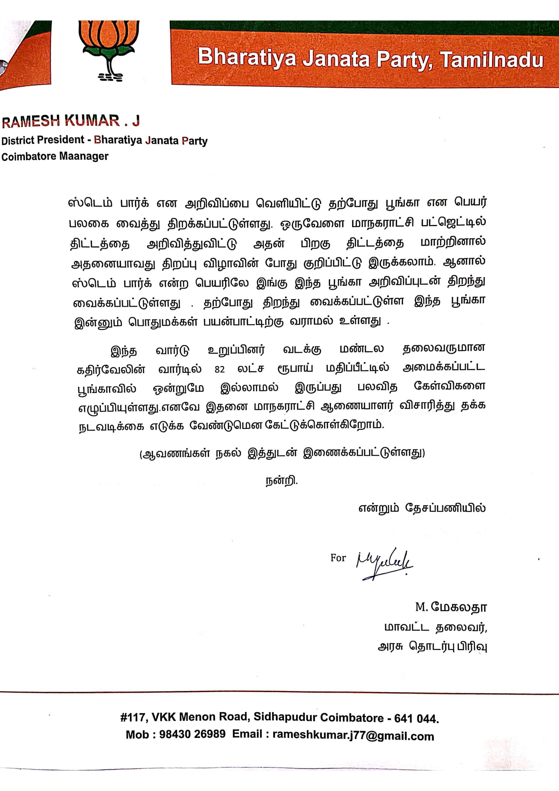 இந்த விவகாரம் தொடர்பாக, கோவை பாஜக மாநகர் மாவட்ட அரசு தொடர்பு பிரிவு மாவட்ட தலைவர் மேகலதா தலைமையில் நிர்வாகிகள், கோவை மாநகராட்சி ஆணையரிடம் புகார் மனு அளித்துள்ளனர்.