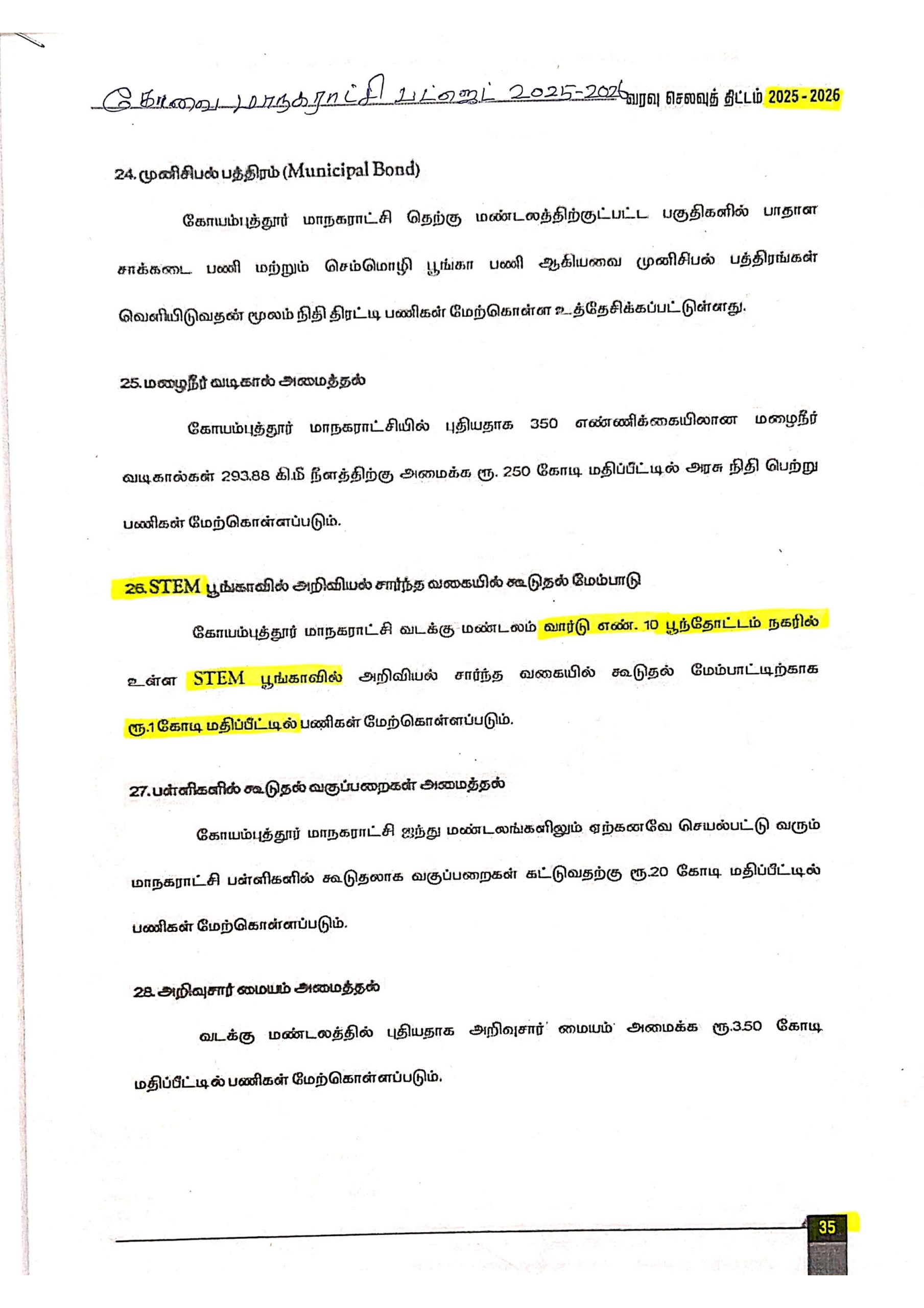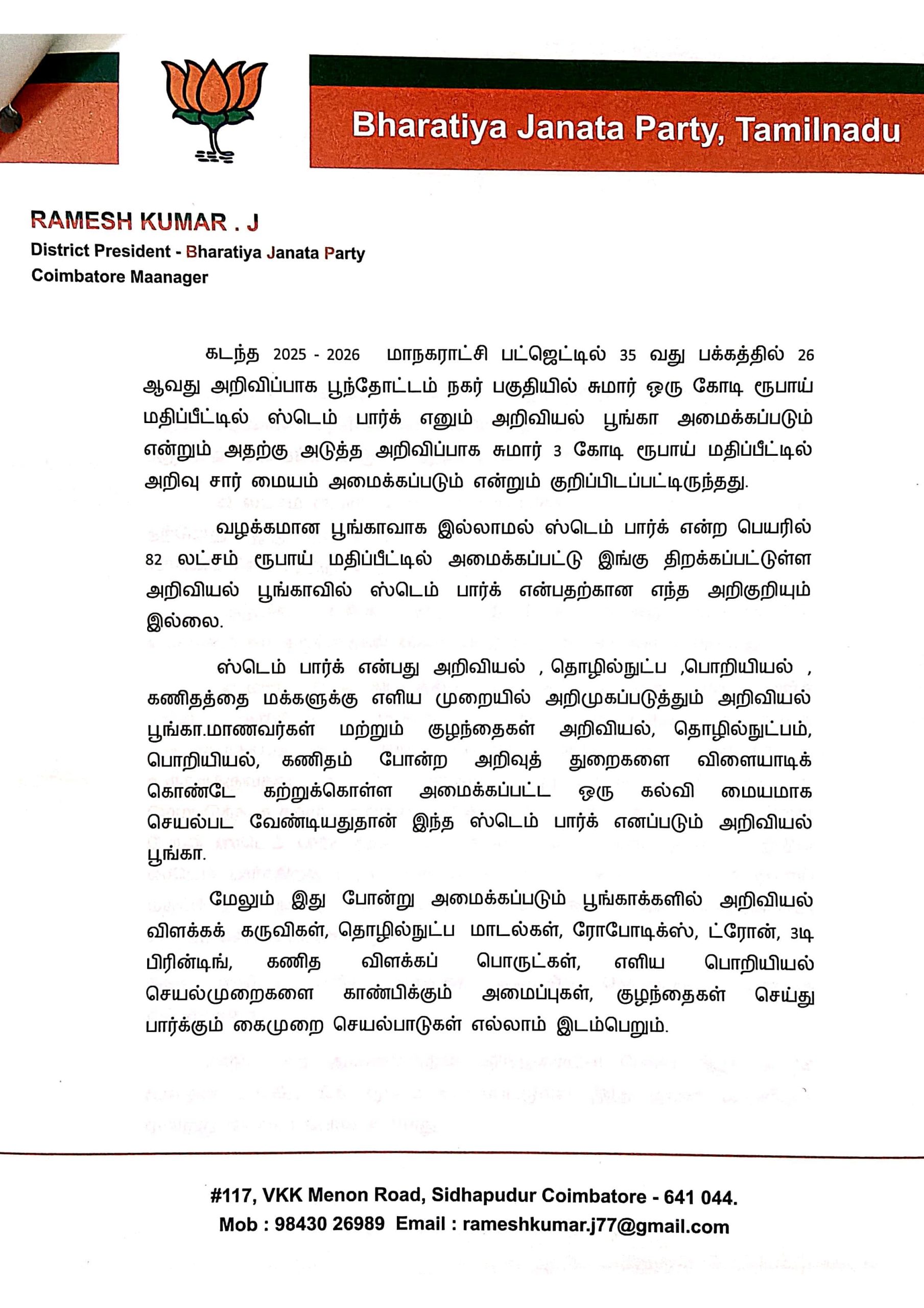 கோவை மாநகராட்சி 2025–26 பட்ஜெட்டில் அறிவிக்கப்பட்ட ‘ஸ்டெம் பார்க்’ திட்டம், குழந்தைகளின் அறிவியல், கணிதம், தொழில்நுட்ப கல்வியை விளையாட்டின் வழியாக வளர்க்கும் உயரிய நோக்கத்துடன் உருவாக்கப்பட்ட திட்டம்.
