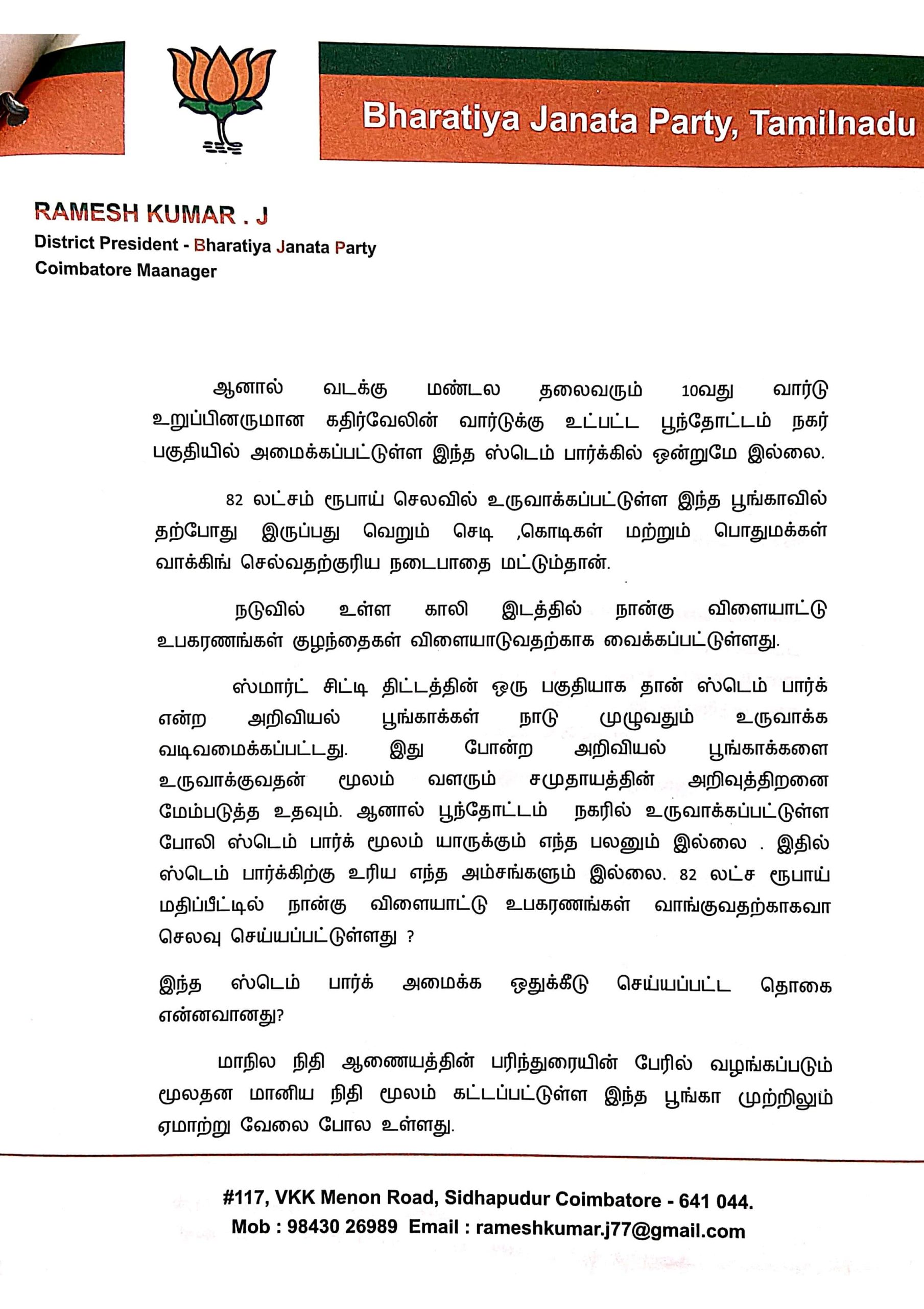 என முழுமையான விசாரணை நடத்தி, பொதுமக்கள் மற்றும் மாணவர்களுக்கு பயன்படும் வகையில் உண்மையான ஸ்டெம் பார்க் அமைக்க நடவடிக்கை எடுக்க வேண்டும் என கோரிக்கை வைக்கப்பட்டுள்ளது.