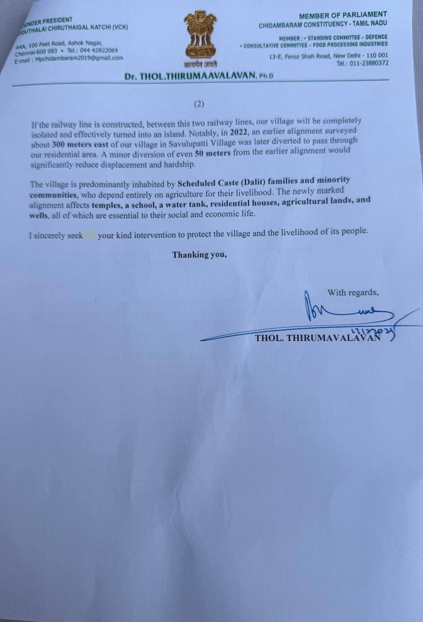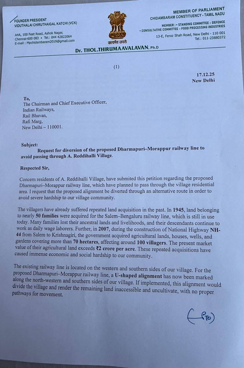 ரயில்வே வளர்ச்சி திட்டங்கள் மக்களின் வாழ்வாதாரத்தை பாதிக்கக் கூடாது என்ற அடிப்படையில், தருமபுரி மற்றும் சிதம்பரம் பகுதிகளைச் சேர்ந்த பொதுமக்களின் நீண்ட நாள் கோரிக்கைகளை, சிதம்பரம் நாடாளுமன்ற உறுப்பினர் தொல். திருமாவளவன் அவர்கள், மத்திய ரயில்வே அமைச்சர் அஷ்வினி வைஷ்ணவ் அவர்களை நேரில் சந்தித்து வலியுறுத்தினார்.
