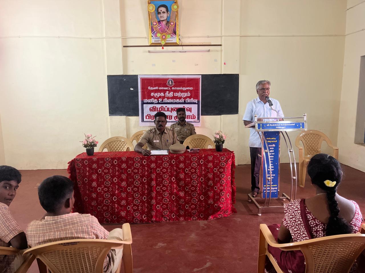 தேனி மாவட்டம் சின்னமனூர் ஸ்ரீ கிருஷ்ணய்யர் மேல்நிலைப்பள்ளியில், காவல்துறை சார்பில் மாணவர்களுக்கான விழிப்புணர்வு முகாம் சிறப்பாக நடைபெற்றது. சமூக நீதி, மனித உரிமைகள், சைபர் பாதுகாப்பு, போதைப்பொருள் ஒழிப்பு, பெண் குழந்தைகளின் பாதுகாப்பு உள்ளிட்ட பல்வேறு முக்கிய அம்சங்கள் குறித்து மாணவர்களுக்கு விரிவாக எடுத்துரைக்கப்பட்டது.