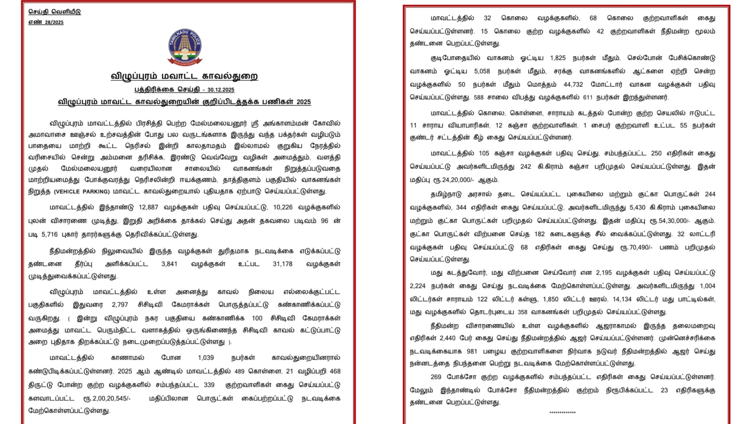 மாவட்டத்தில் காணாமல் போன 1,039 நபர்கள் காவல்துறையினரால் கண்டுபிடிக்கப்பட்டுள்ளனர். 2025 ஆம் ஆண்டில் மாவட்டத்தில் 489 கொள்ளை, 21 வழிப்பறி 468 திருட்டு போன்ற குற்ற வழக்குகளில் சம்பந்தப்பட்ட 339 குற்றவாளிகள் கைது செய்யப்பட்டு களவாடப்பட்ட ரூ.2,00,20,545/- மதிப்பிலான பொருட்கள் கைப்பற்றப்பட்டு நடவடிக்கை மேற்கொள்ளப்பட்டுள்ளது.