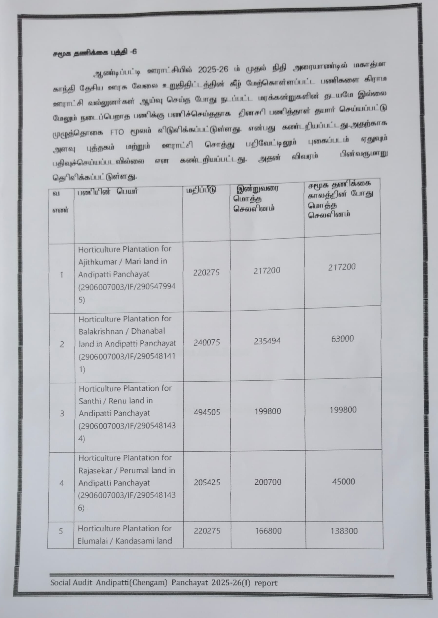திருவண்ணாமலை மாவட்டம், செங்கம் அடுத்த ஆண்டிப்பட்டி ஊராட்சியில், மகாத்மா காந்தி தேசிய ஊரக வேலைவாய்ப்பு உறுதி திட்டம் (MGNREGS) கீழ் மேற்கொள்ளப்பட்ட பணிகளில், ரூ.26 லட்சத்திற்கும் அதிகமான ஊழல் நடைபெற்றுள்ளதாக பொதுமக்கள் குற்றச்சாட்டு எழுப்பியுள்ளனர்.