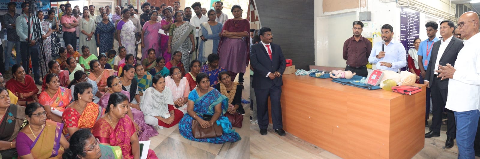 AED என்பது எளிதில் பயன்படுத்தக்கூடிய கையடக்க கருவி ஆகும். மருத்துவப் பகுதி இல்லாதவர்களும், குரல் வழி வழிமுறைகளைப் பின்பற்றி இதனை பாதுகாப்பாக இயக்க முடியும். பொதுமக்கள் அதிகம் கூடும் அரசு அலுவலகங்கள் மற்றும் பொது இடங்களுக்கு இது மிகவும் உகந்ததாக அமைகிறது. பயிற்சியில், மாதிரிப் பயிற்சிகள் மற்றும் நேரடி செயல்விளக்கங்கள் மூலம் அலுவலக ஊழியர்கள் அவசரகால சூழ்நிலைகளில் நம்பிக்கையுடன் செயல்படுவதற்கான நடைமுறை அனுபவத்தை பெற்றனர்.