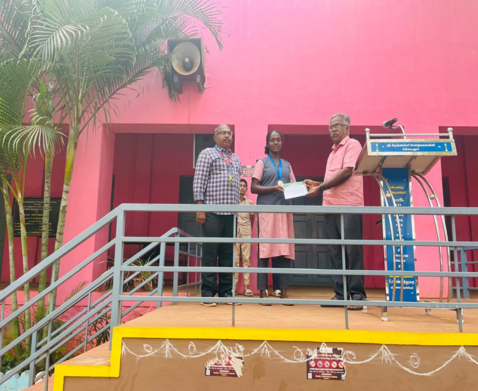 மாணவியைப் பாராட்டிப் பேசிய பள்ளி தலைமை ஆசிரியர் திரு. எஸ். பாண்டித்துரை,