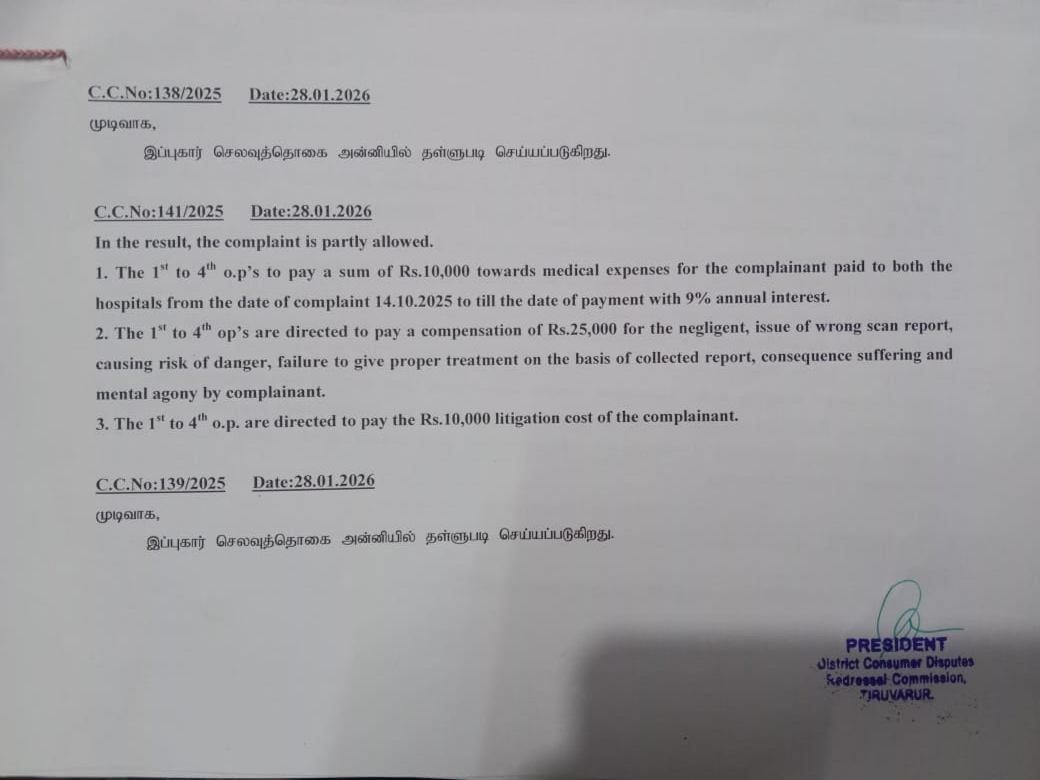 வழக்கை விசாரித்த திருவாரூர் நுகர்வோர் குறைதீர் ஆணையம், ஸ்கேன் ரிப்போர்ட் மாற்றம் போன்ற முக்கிய தவறு, மருத்துவரின் கவனக்குறைவை வெளிப்படுத்துவதாகக் குறிப்பிட்டது. இது நோயாளியின் உடல்நலத்திற்கு நேரடி ஆபத்தை ஏற்படுத்தும் செயல் என நீதிமன்றம் சுட்டிக்காட்டியது.