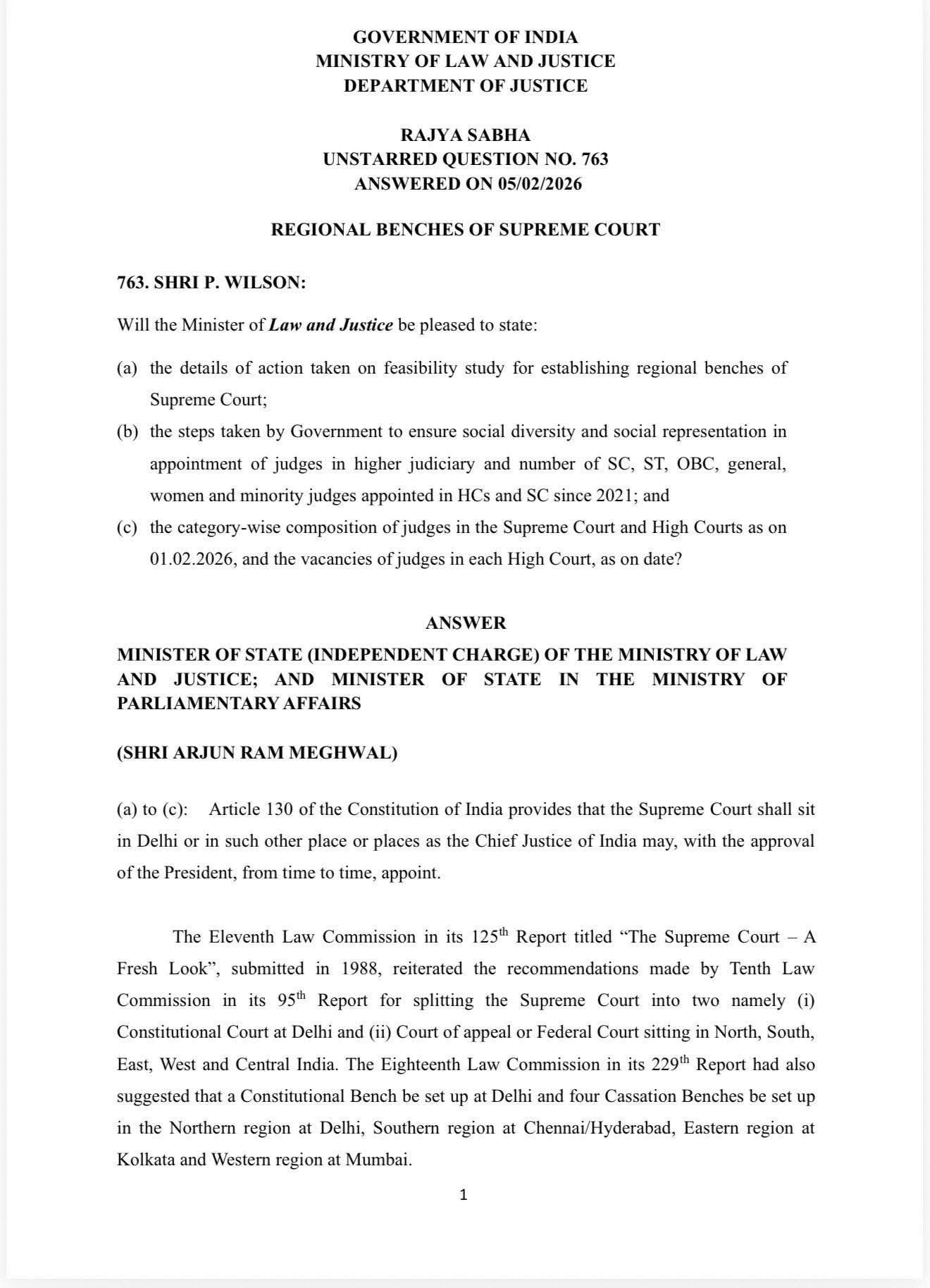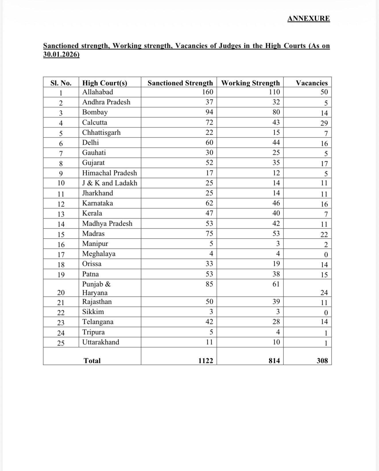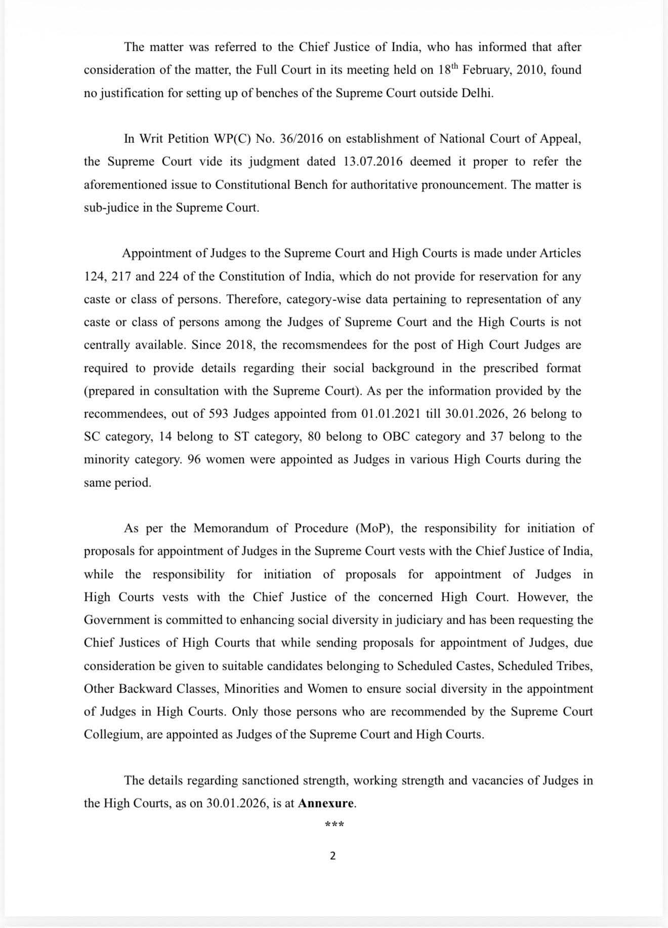 01.01.2021 முதல் 30.01.2026 வரை நியமிக்கப்பட்ட 593 நீதிபதிகளில்,  26 பேர் SC சமூகத்தையும் , 14 பேர்  ST சமூகத்தையும், 80 பேர் OBC சமூகத்தையும் சேர்ந்தவர்கள்.