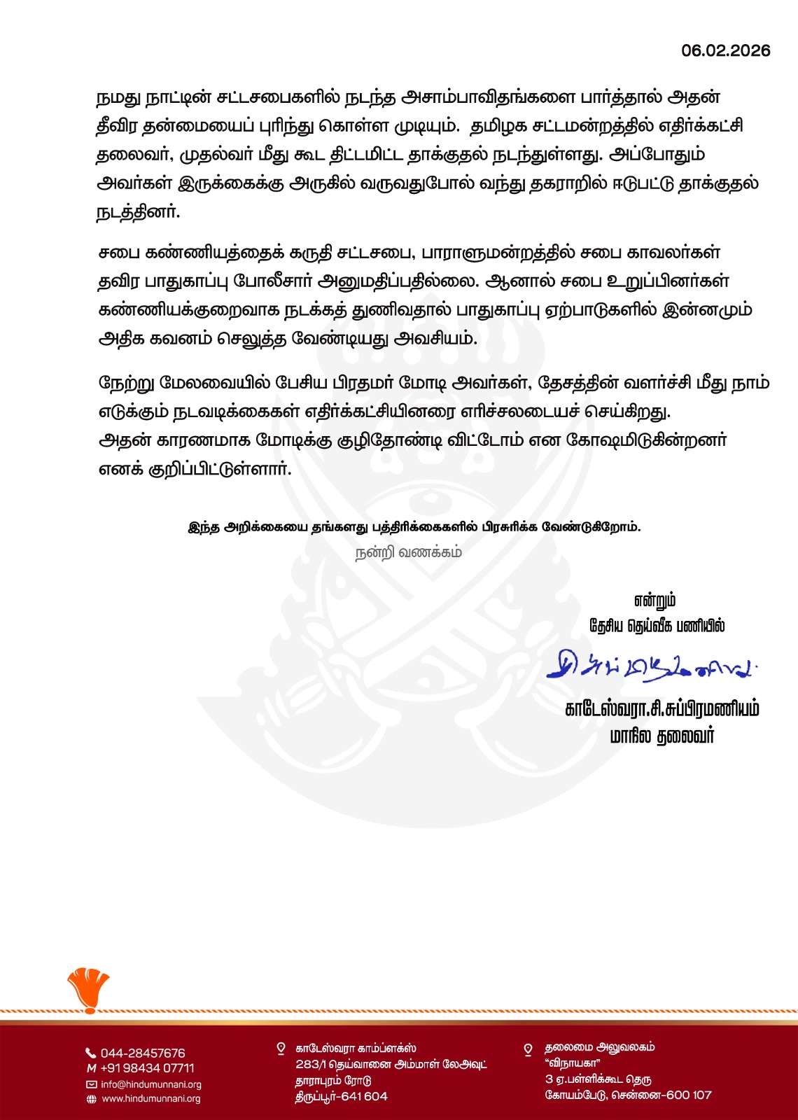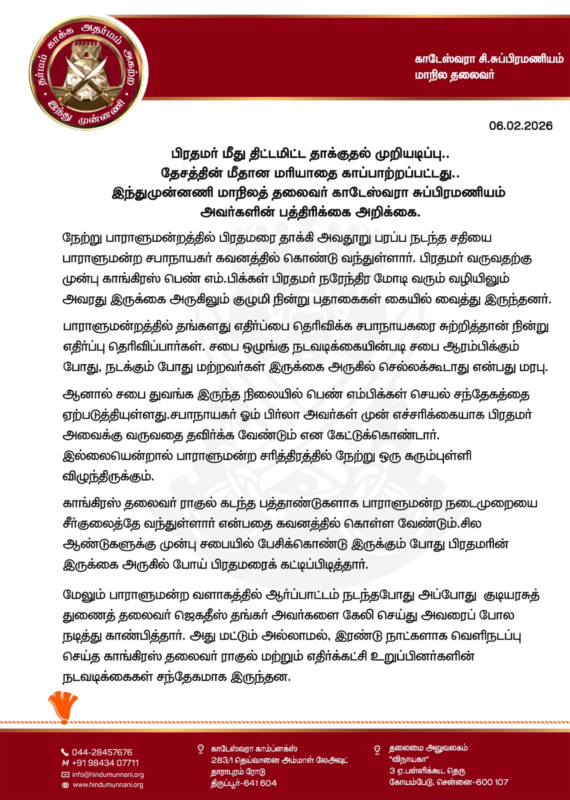 இரண்டு நாட்களாக காங்கிரஸ் தலைவர் மற்றும் எதிர்க்கட்சி உறுப்பினர்கள் வெளிநடப்பு செய்ததும், அவர்களின் செயல்பாடுகளும் சந்தேகத்திற்கிடமானதாக இருந்ததாக அறிக்கையில் கூறப்பட்டுள்ளது. மேலும், தமிழக சட்டமன்றத்தில் முதல்வர் மீது நடந்ததாக கூறப்படும் முந்தைய சம்பவங்களையும் சுட்டிக்காட்டி, இத்தகைய செயல்கள் பாராளுமன்ற பாதுகாப்பை மீண்டும் பரிசீலிக்க வேண்டிய அவசியத்தை வலியுறுத்தியுள்ளது.