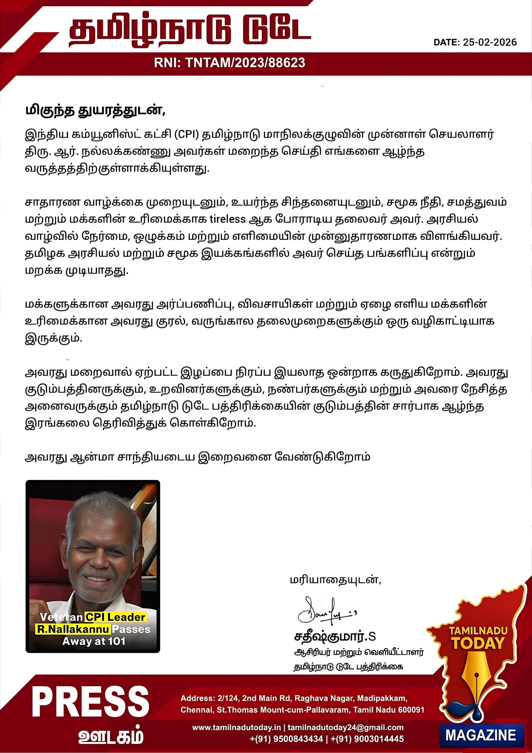 தமிழக அரசியலில் “எளிமை” என்ற சொல்லை உயிரோட்டத்துடன் வாழ்ந்து காட்டிய மனிதர் நல்லகண்ணு. 100 ஆண்டுகளைத் தாண்டிய அவரது வாழ்க்கை, ஒரு அரசியல் பயணம் மட்டுமல்ல; அது ஒரு தியாக வரலாறு.