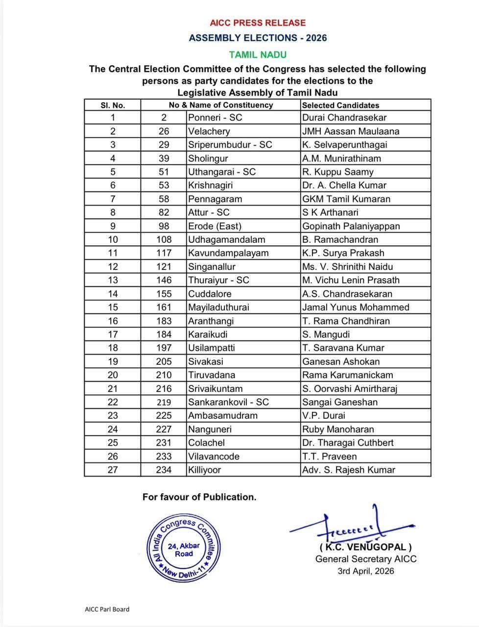 🔵 காங்கிரஸ் வேட்பாளர் பட்டியல் – முக்கிய அம்சங்கள்: