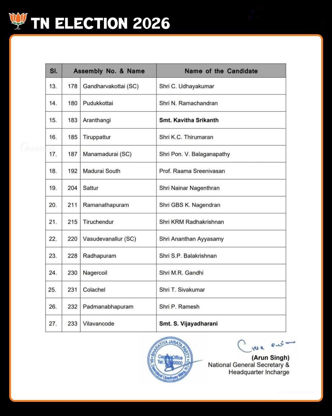 பாரதீய ஜனதா கட்சி வெளியிட்ட பட்டியலில்: