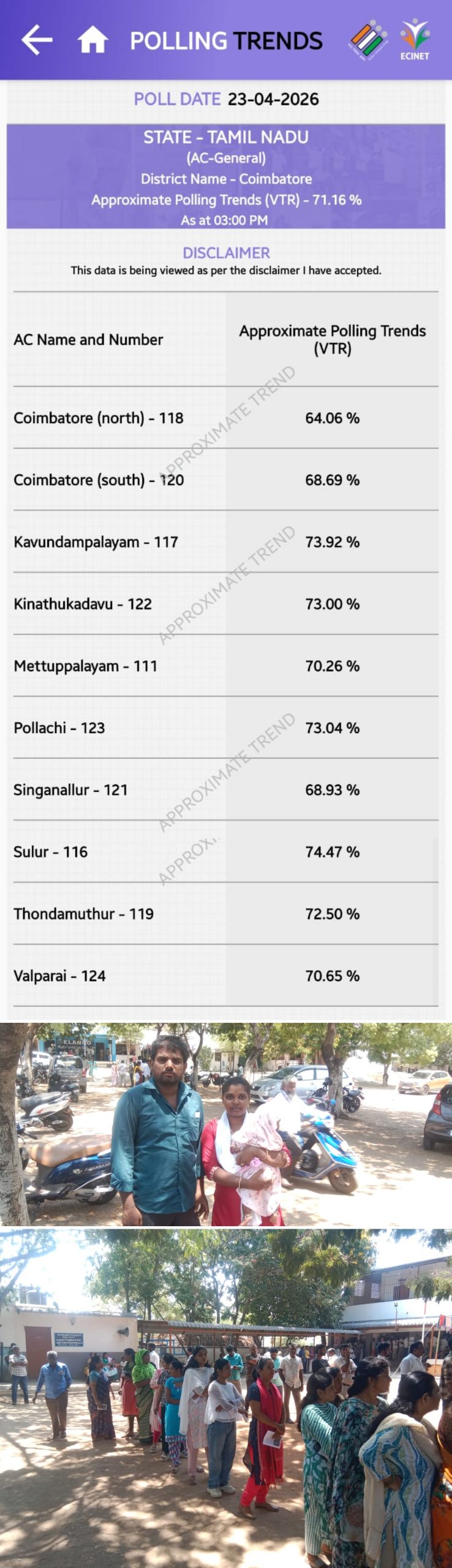 2026 சட்டமன்றத் தேர்தலை முன்னிட்டு கோவை மாவட்டத்தில் வாக்குப்பதிவு உற்சாகமாக நடைபெற்று வருகிறது.