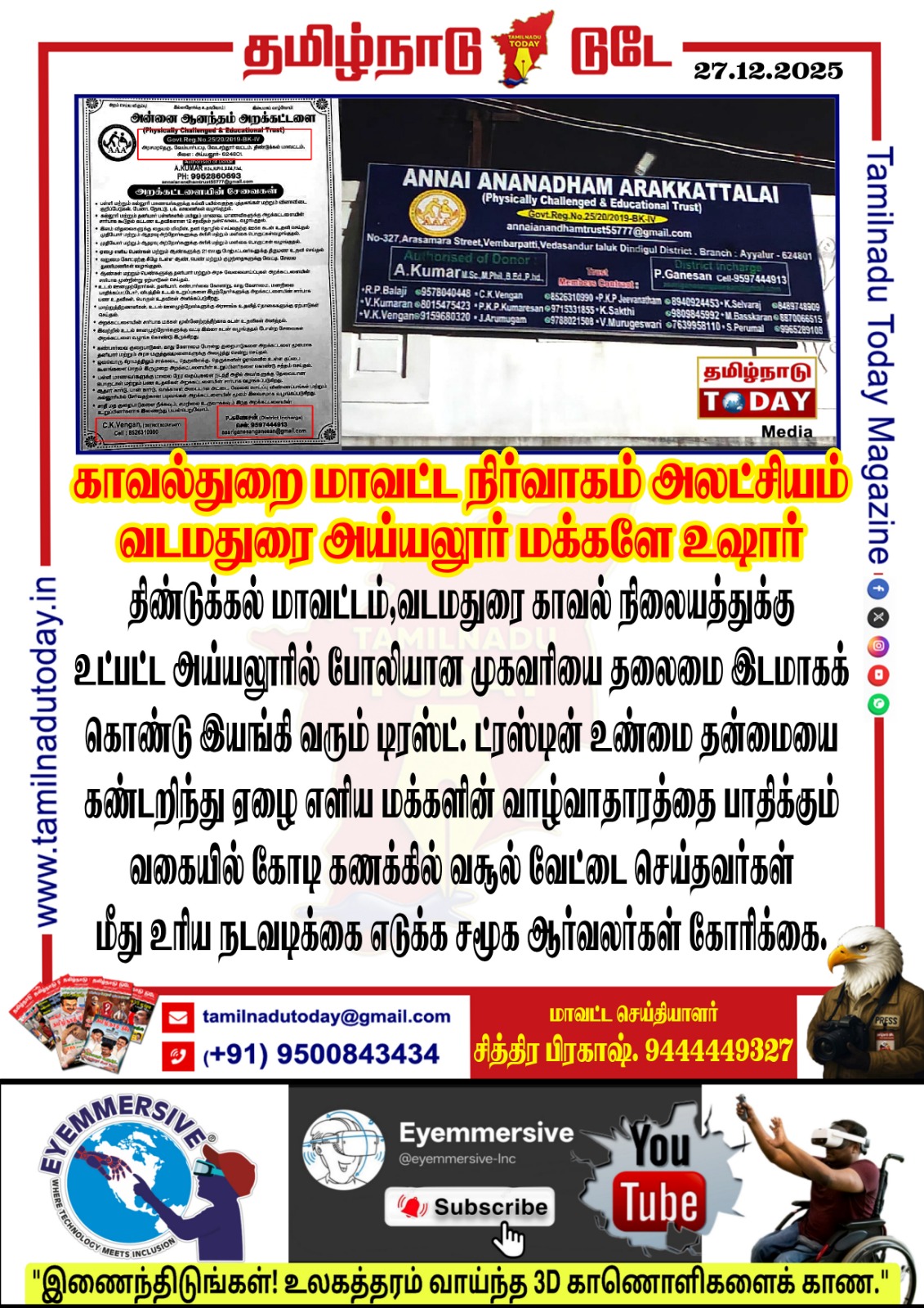 “அன்னை ஆனந்தம் அறக்கட்டளை” – பணம் மோசடி குற்றச்சாட்டு…! திண்டுக்கல் மாவட்டம், வடமவுரை காவல் நிலைய எல்லைக்குட்பட்ட அய்யலூரில்,உடல் ரீதியாக சவாலானோர் & கல்வி உதவி என்ற பெயரில் இயங்கி வரும்“அன்னை ஆனந்தம் அறக்கட்டளை” மீது, 👉 போலி முகவரியை தலைமையகமாகக்…