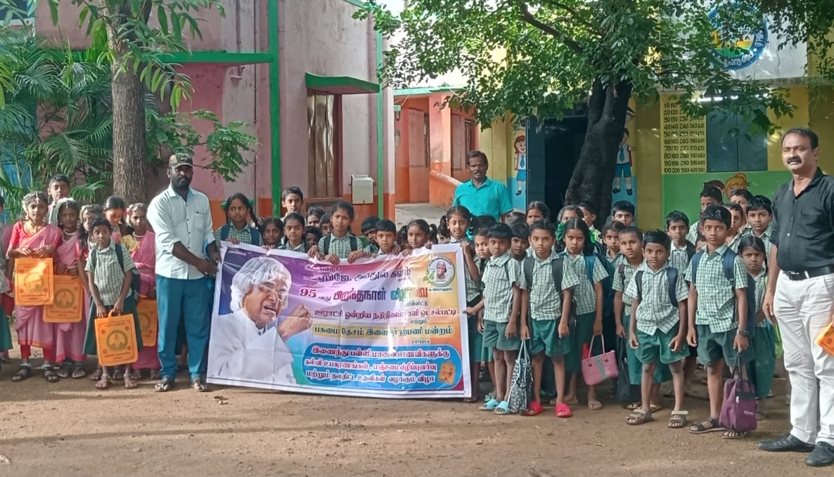 🌿 டாக்டர் ஏ.பி.ஜே. அப்துல் கலாம் 94-வது பிறந்தநாள் விழா – கல்வி உபகரணங்கள் வழங்கல் மற்றும் மஞ்சப்பை விழிப்புணர்வு 🌿